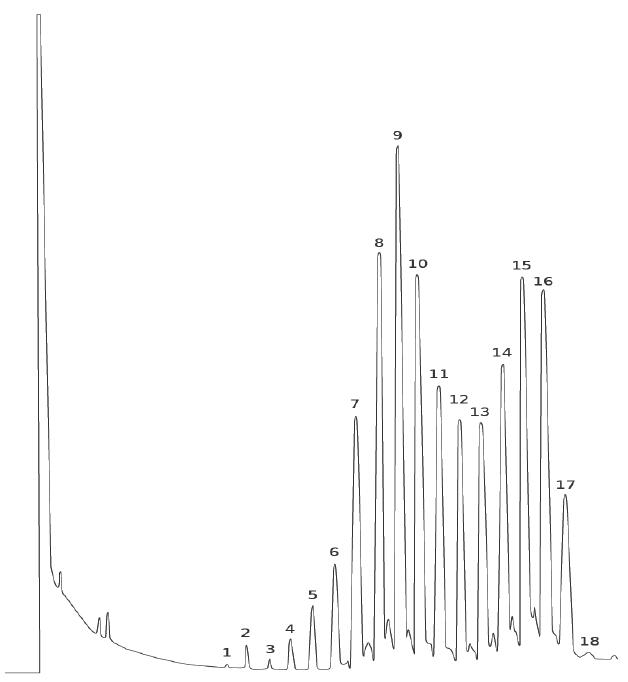 樣品:1.T24   2. 膽 固 醇  3.T26  4.T28   5. T30 6.T32    7.T34     8. T36     9. T38     10.T40 11.T42    12. T44     13. T46    14. T48   15.T50     16. T52     17. T54    18.T56(T= 總碳數)