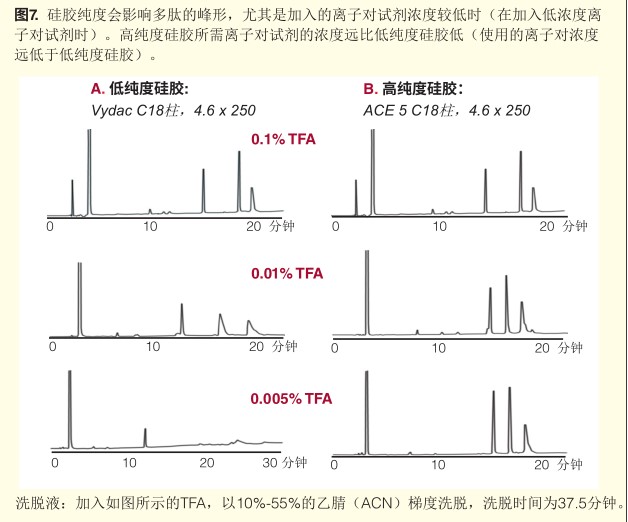 三氟乙酸:使用最廣泛,在分析得到的峰形相似的情況下,硅膠純度越高,使用的離子對(duì)試劑濃度可以相對(duì)更低。