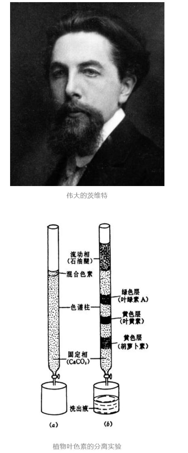 1906年,俄國(guó)植物學(xué)家茨維特發(fā)表了他的實(shí)驗(yàn)結(jié)果:為了分離植物色素,他將含有植物色素的石油醚提取液倒入裝有碳酸鈣粉末的玻璃管中,并用石油醚自上而下淋洗,由于不同的色素在碳酸鈣顆粒表面的吸附力不同,隨著淋洗的進(jìn)行,不同色素向下移動(dòng)的速度不同,從而形成一圈圈不同顏色的色帶,使各色素成分得到了分離。他將這種分離方法命名為色譜法(chromatography)。