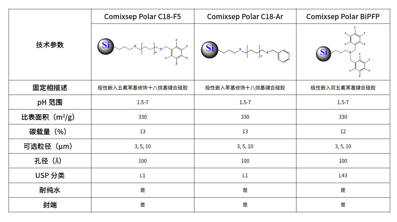 菲羅門公司的Comixsep系列為創新的混合作用(Mixed-mode)液相色譜柱,通過在碳鏈上嵌入極性基團和芳香基團,使色譜柱兼具疏水作用、極性作用和π-π作用從而具有與常規C18不一樣的獨特選擇性,非常適合用于HPLC分析方法開發。