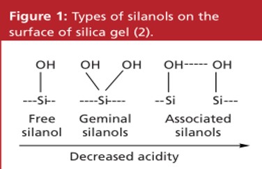 殘余的硅羥基存在于所有的硅膠鍵合相的表面。由于是弱酸的特性,這些硅羥基會同某些分析物相互作用,尤其是同一些堿性化合物。因為硅羥基的Pka值大約是在4.5左右。