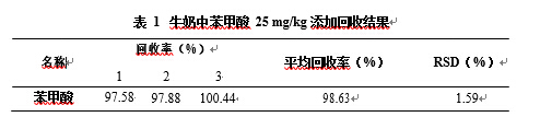 1、25 mg/kg 牛奶中苯甲酸的添加回收結(jié)果