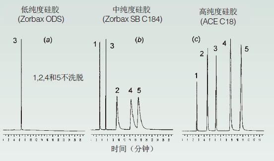 圖1. 硅膠純度和峰拖尾(a) 低-、(b) 中-、和(c) 高-純度硅膠。