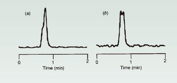 改變柱并未糾正這個問題(更換色譜柱不能解決此問題),所以玻璃料(篩板)堵塞并非導(dǎo)致這一現(xiàn)象的原因。如果柱上樣品的質(zhì)量減少(減少上樣量)(圖4b),峰形看起來更像是兩個峰,而不是一個肩形峰。