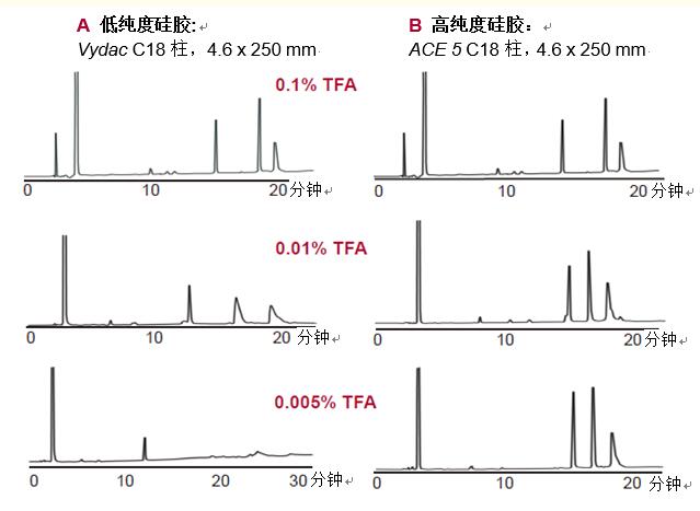 圖7. 硅膠純度會影響多肽的峰形,尤其是加入的離子對試劑濃度較低時。高純度硅膠所需離子對試劑的濃度遠比低純度硅膠低。