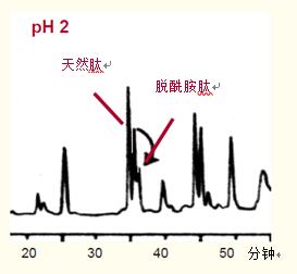 在pH為2的肽圖中,含有天冬氨酸的脫酰胺肽的疏水性比含天冬酰胺的天然肽略強(qiáng),因此比天然肽略晚洗脫出來(lái),如圖39所示。